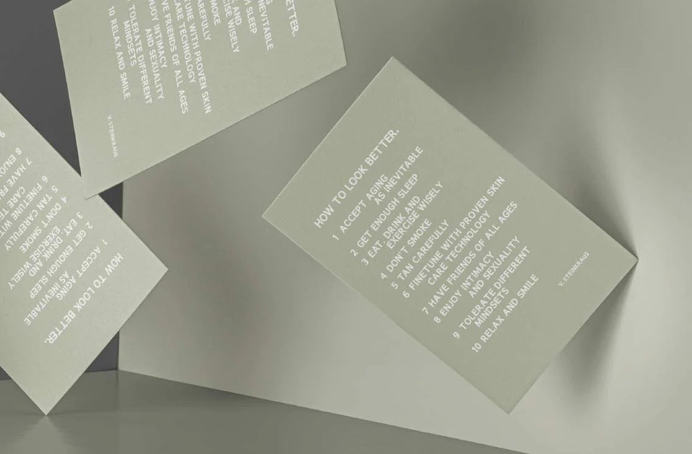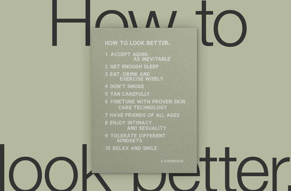 Beauty is a statement, and true beauty always comes from all sides, from within and without. Following Fischli & Weiss, I have highlighted ten points in the context of HOW TO LOOK BETTER. The most important: Only those who accept that the aging process cannot be stopped, but can at best be slowed down, can be beautiful: ACCEPT AGING AS INEVITABLE. A reflective approach to one's own health and an open mindset promote zest for life and make us biologically younger than our calendar years.