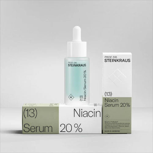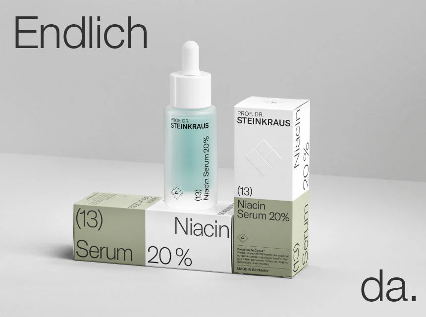 Because niacinamide is very well tolerated by the skin, it can be applied topically in high concentrations (up to 20%). The (13) Niacin Serum 20% from Prof. Dr. Steinkraus's TetCode4 series also contains a small amount of hyaluronic acid (0.3%), which gives the product noticeably nourishing properties and ensures a particularly pleasant application. The serum's slightly bluish hue is derived from connective tissue-strengthening copper ions.