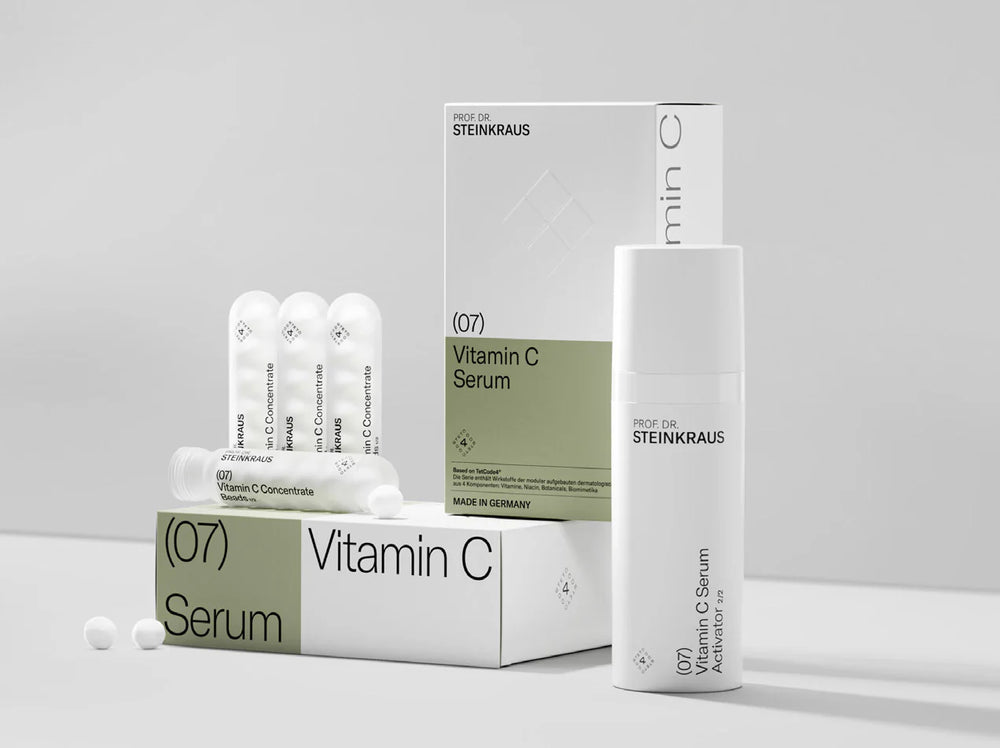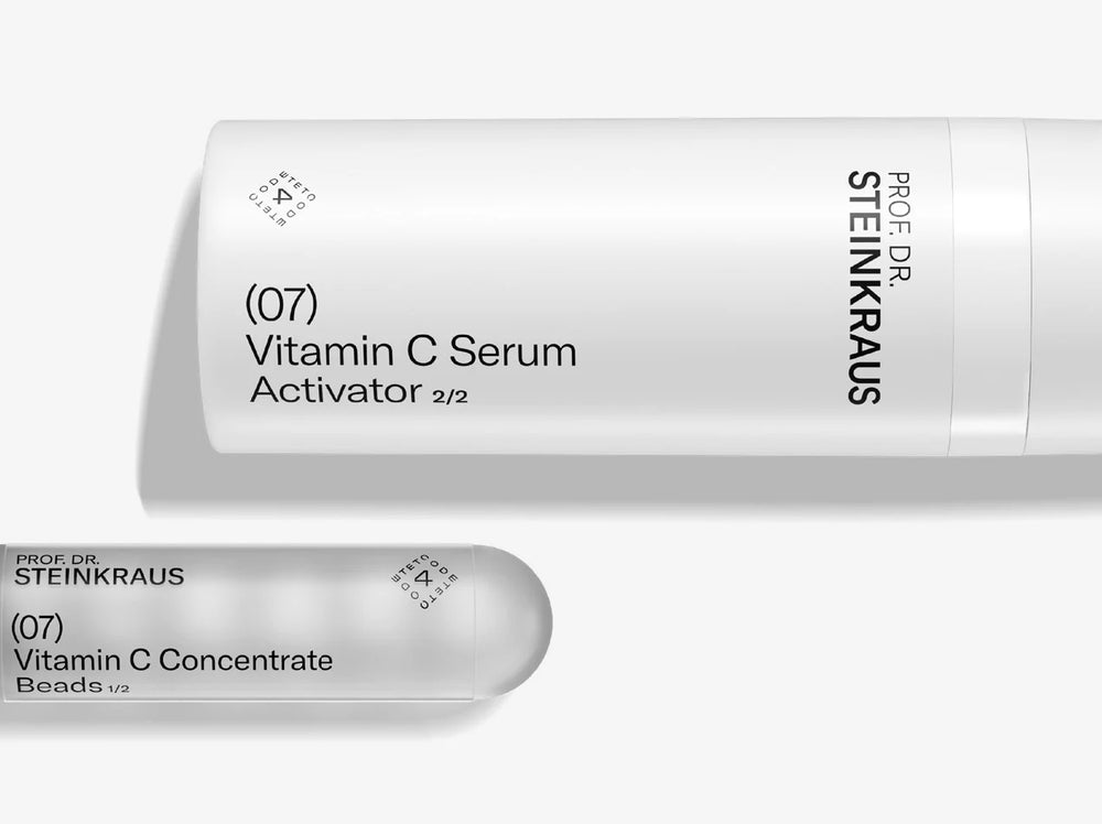 Vitamin C has one Achilles heel. It oxidizes immediately in air, rendering it ineffective. Therefore, it should be freshly prepared immediately before use. The TetCode4 vitamin C product achieves this through a manufacturing and processing technology specifically tailored to this weakness of vitamin C. Freeze-dried, small vitamin C spheres (comparable to cotton balls) are dissolved individually in the palm of the hand by adding activator fluid. These spheres are a lyophilisate, meaning they dissolve in liquid. The freshly produced vitamin C is ideally applied in the morning after showering or immediately after cleansing the face, creating an elixir for facial care and the start of the day that is hard to beat.